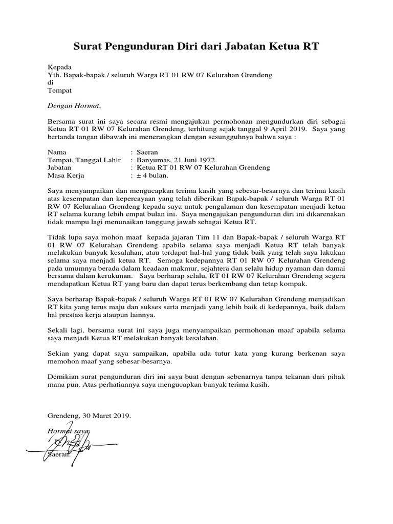 Berikut detail informasi tentang contoh surat pengunduran diri ketua rt. These are so many great picture list that could become your enthusiasm and informational purpose of contoh surat pengunduran diri dari ketua rt design ideas on your own collections. Saya mengucapkan banyak terimakasih atas kesempatan dan kepercayaan yang telah diberikan kepada saya untuk bekerja sebagai ketua rt 07 rw 07 dusun pejagan, desa kutabawa, kecamatan karangreja. Program desa kepada yth kepala desa kutabawa dengan hormat melalui surat ini saya tarman bermaksud untuk mengundurkan diri sebagai ketua rt 07 rw 07 dusun pejagan desa kutabawa kecamatan karangreja terhitung sejak. Contoh surat pengunduran diri dari jabatan sekretaris rt.melalui surat ini saya rohmatulloh bermaksud untuk mengundurkan diri sebagai ketua rt 01 rw 01 dusun dlimas desa dlimas kecamatan tegalrejo terhitung sejak tanggal 1 oktober 2012.
